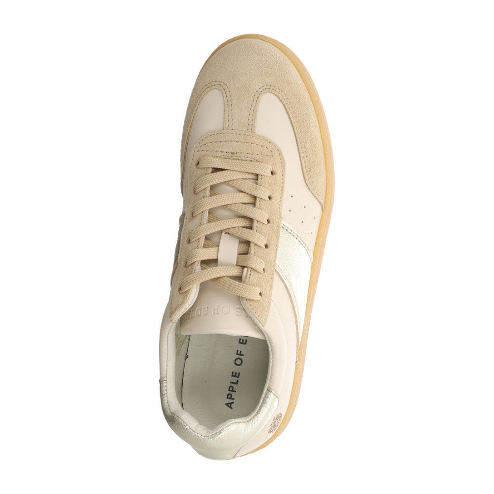 Küsten-Edition: Der Apple of Eden ASTER Sneaker SS26-ASTER 21 in CHAMPAGNE kombiniert Metallic-Ziegenleder mit Metallic-Schimmer; weiches Lederfutter und Lederdecksohle trifft auf eine geschmeidige Sohle, die mitgeht – ein Begleiter für City-Bummel und Kaffeepause; Als Ergänzung passen HALO Slingback (SS26-HALO 1) sowie ODESSA Sneaker (SS26-ODESSA 90).