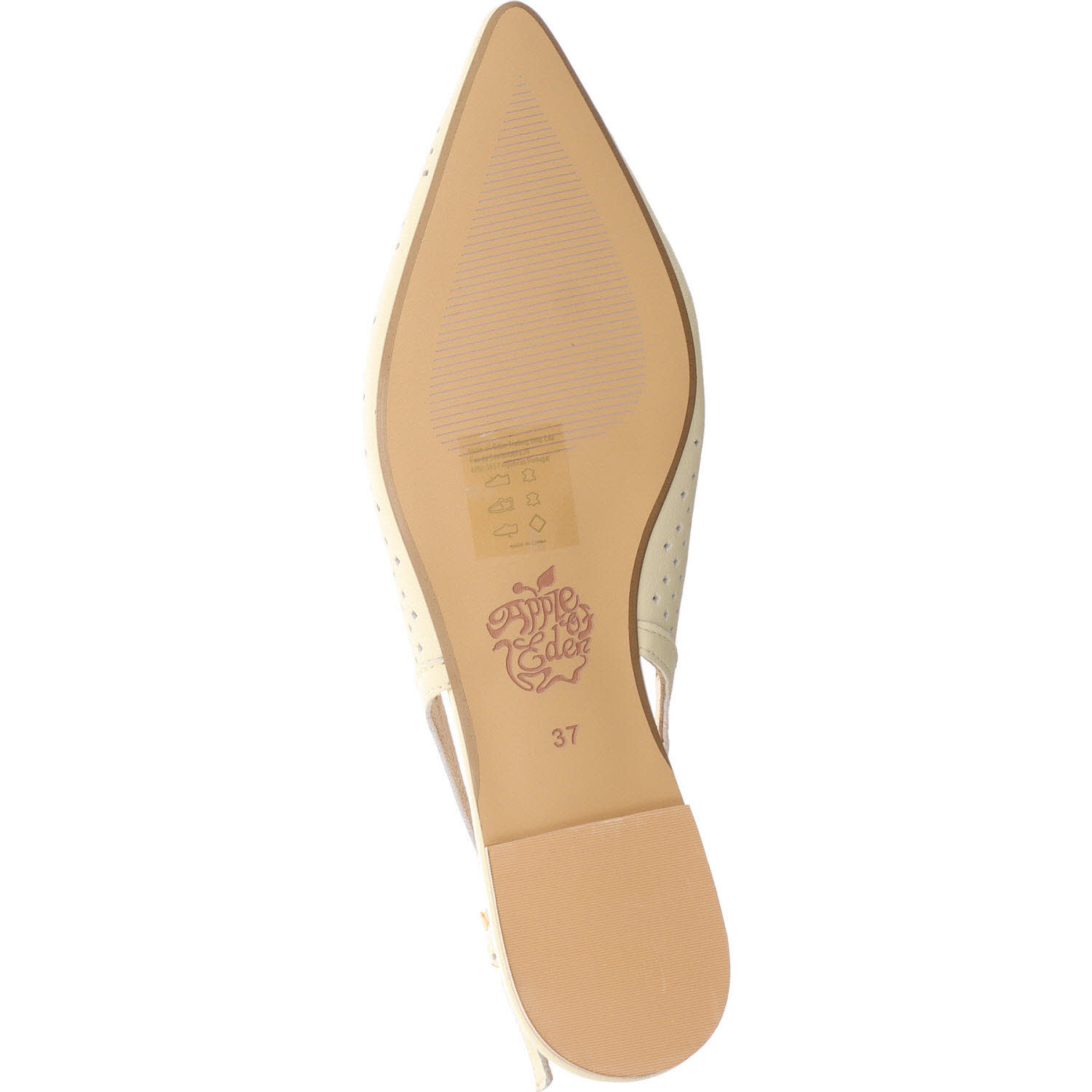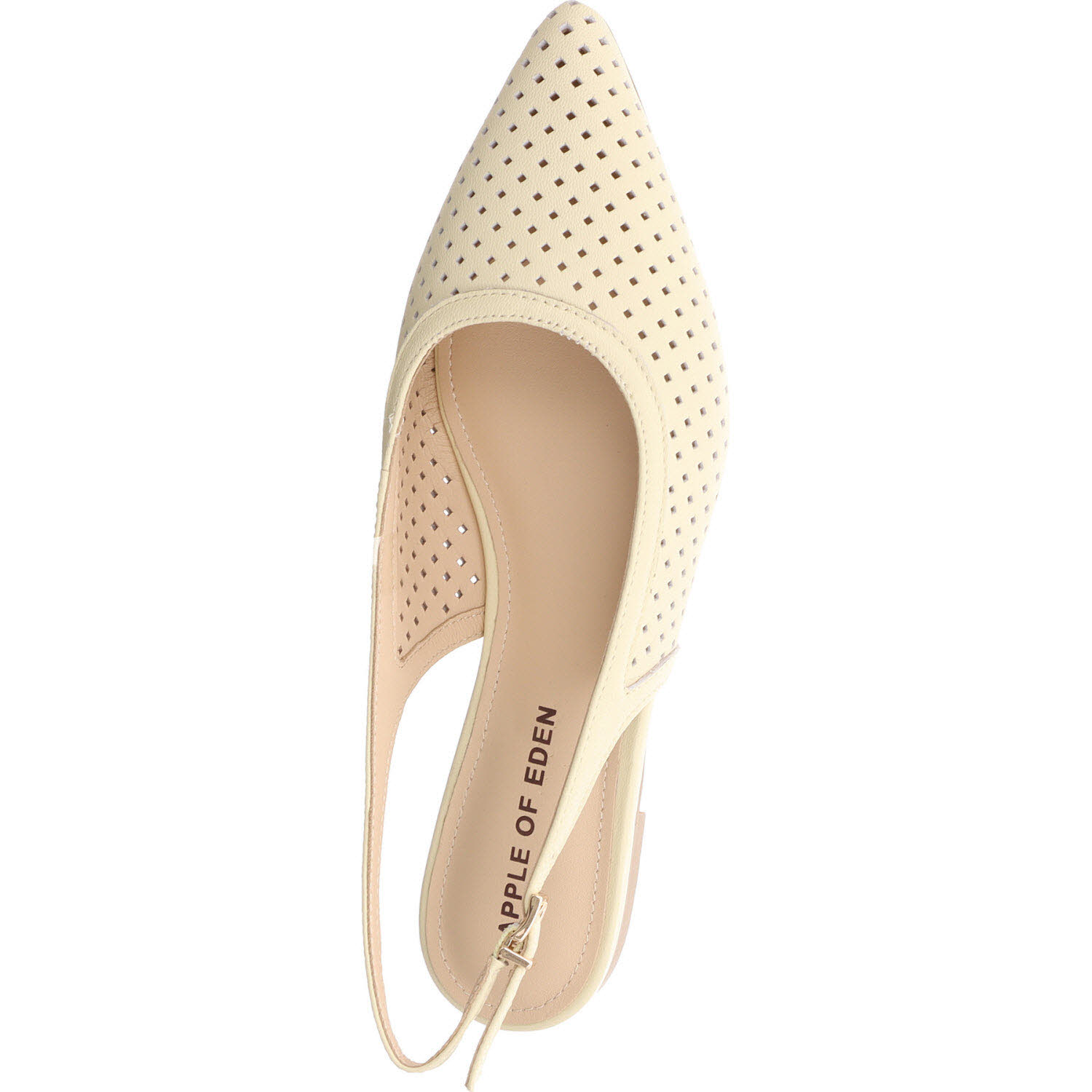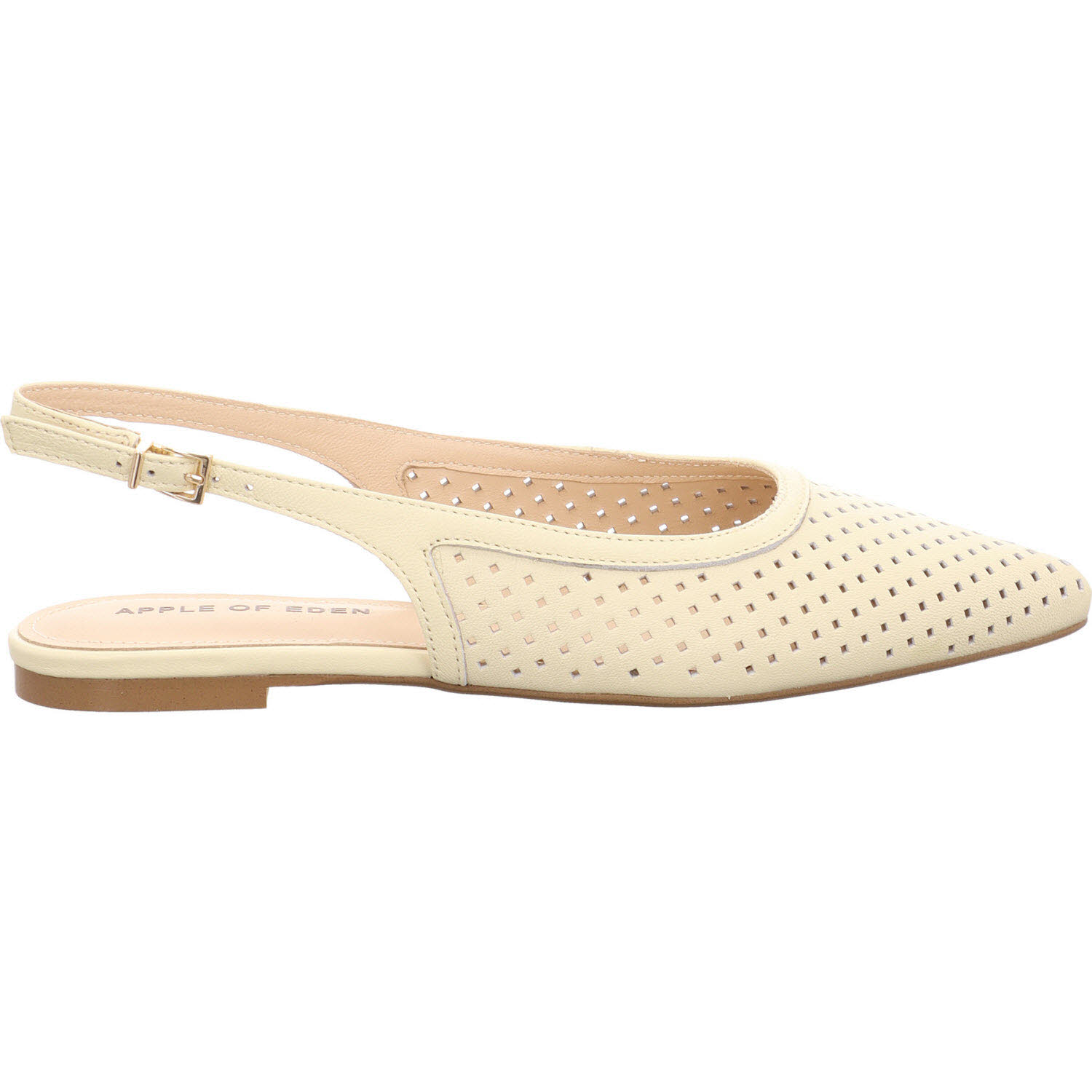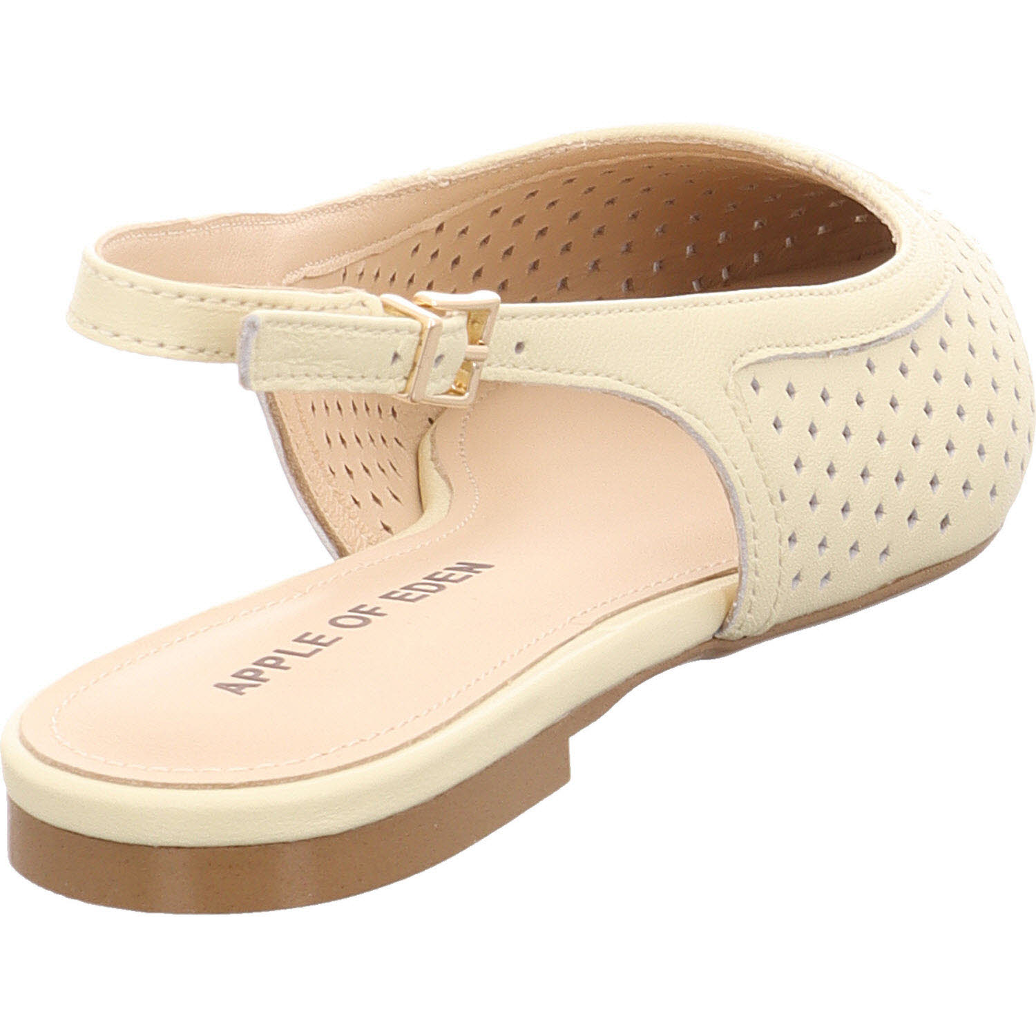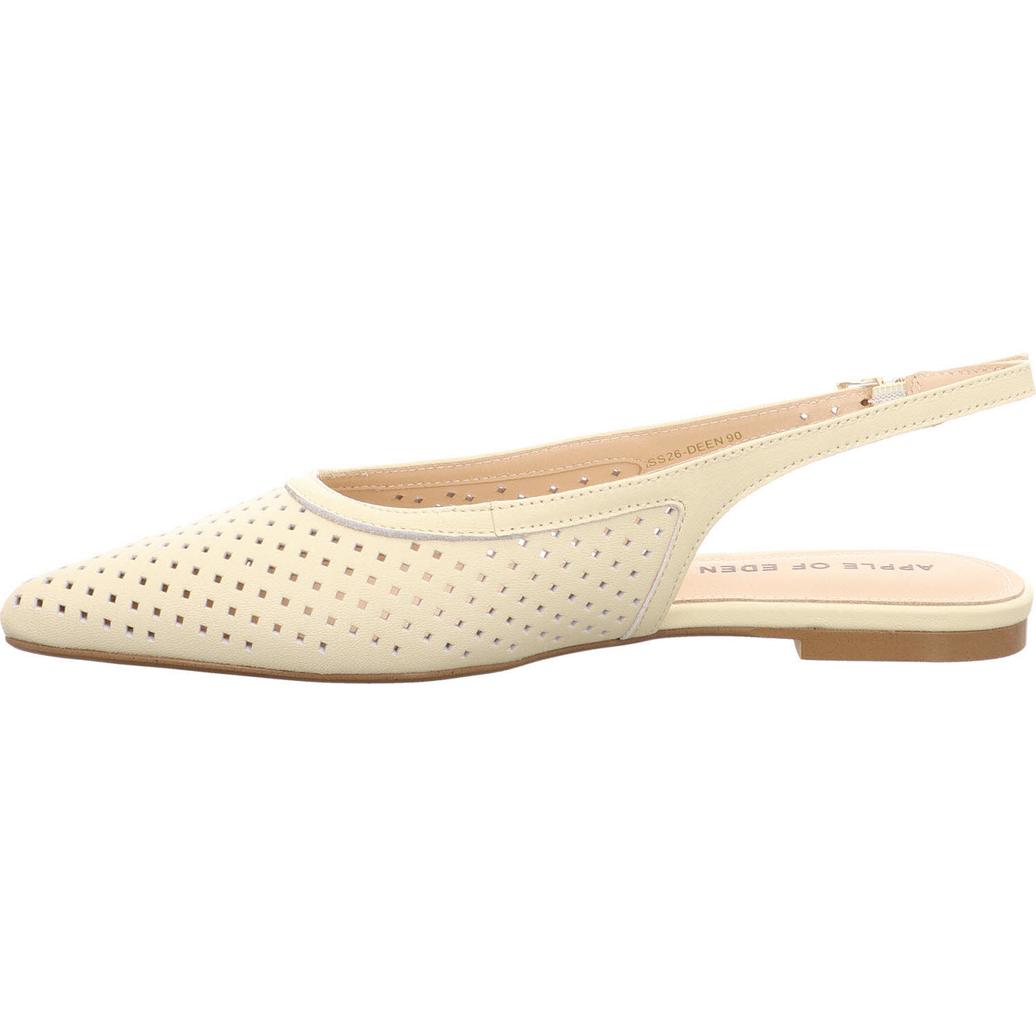 Vanille-Beige mit Cut-outs: der Apple of Eden DEEN in seiner leichtesten, sommerlichsten Variante. Im hellen Leder fallen die Stanzungen besonders auf – fast filigran, wie ausgeschnitten. Schnalle, Lederfutter, Lederdecksohle, flache Sohle. Der Schuh für Frauen, die im Sommer lieber geschlossen tragen, aber keine Hitze am Fuß mögen. Passt zu weißer Hose, Leinenkleid in Creme, hellblauer Jeans.
