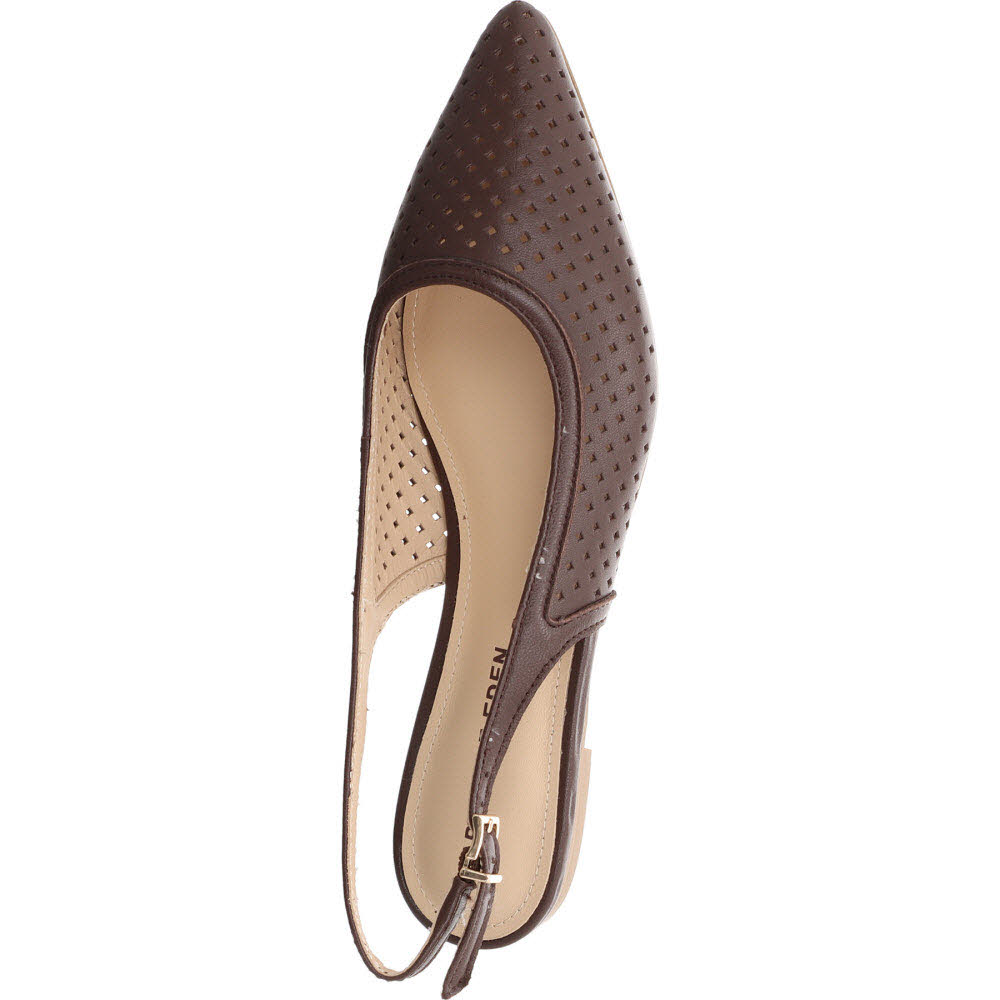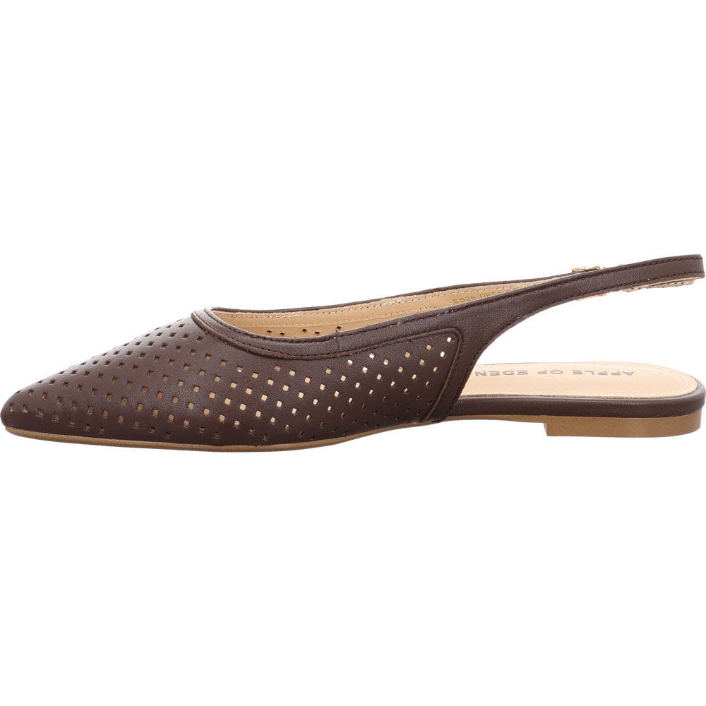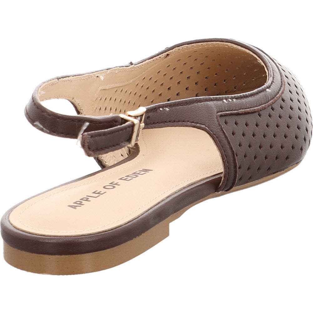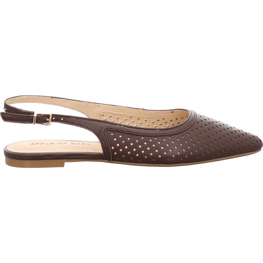Dunkelbraun mit Cut-outs: der Apple of Eden DEEN für Frauen, die die schwarze Version zu streng finden. Die Stanzungen im glatten Ziegenleder wirken in Dunkelbraun wärmer, die Schnalle hält den Fuß sicher. Lederfutter, Lederdecksohle, flache Sohle. An warmen Tagen lässt der DEEN genug Luft ans Leder, um ein geschlossener Schuh zu bleiben, ohne sich wie einer anzufühlen. Passt zu Jeans, Creme-Hose, schwarzem Kleid.