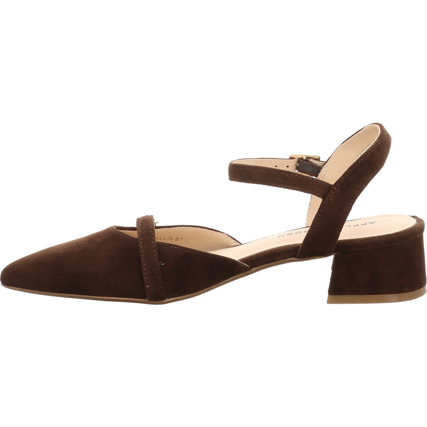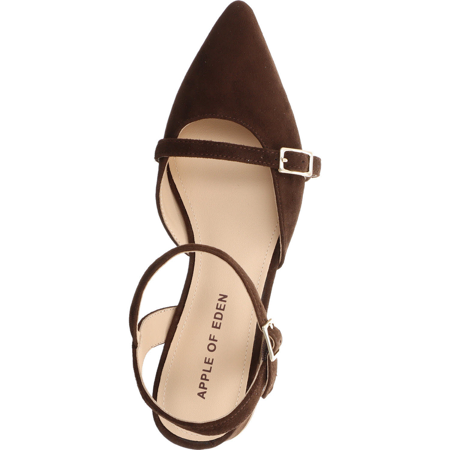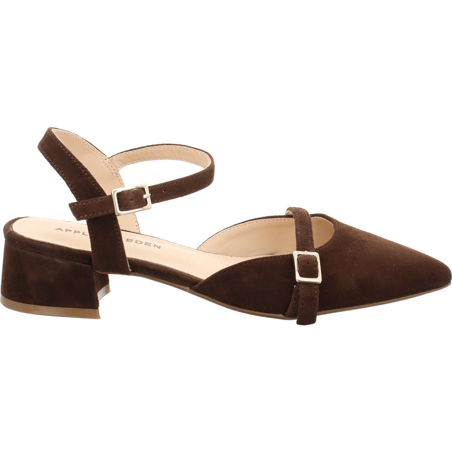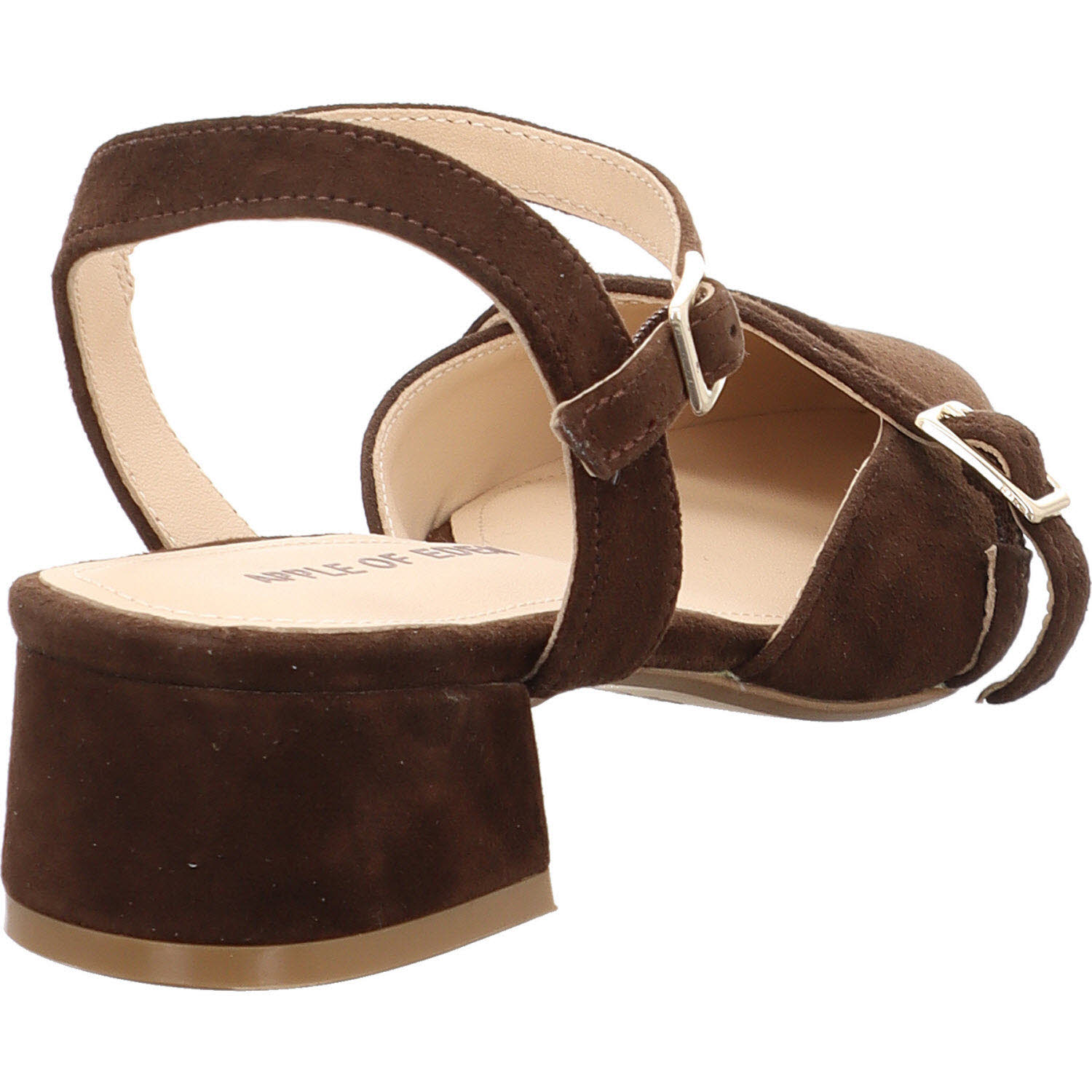 Die Apple of Eden ELLIS in Dunkelbraun: Ziegenveloursleder mit Schnalle für stabilen Sitz. Wärmer im Ton als die schwarze Version, passend zu Jeans, Creme-Hose, Khaki-Rock. Lederfutter, Lederdecksohle, flache Sohle. Die stabilere Alternative für Frauen, die bei Sandalen auf Halt nicht verzichten wollen.