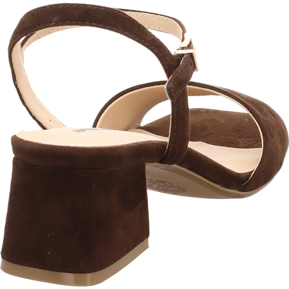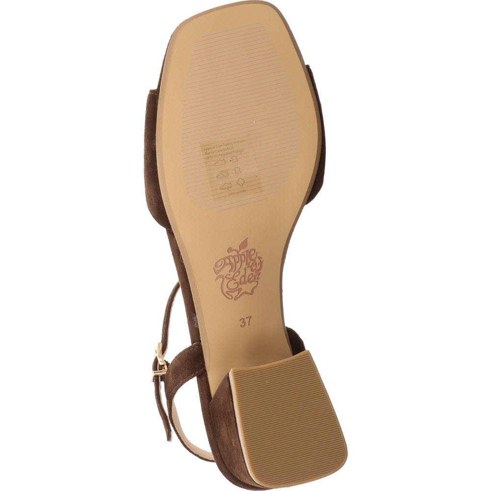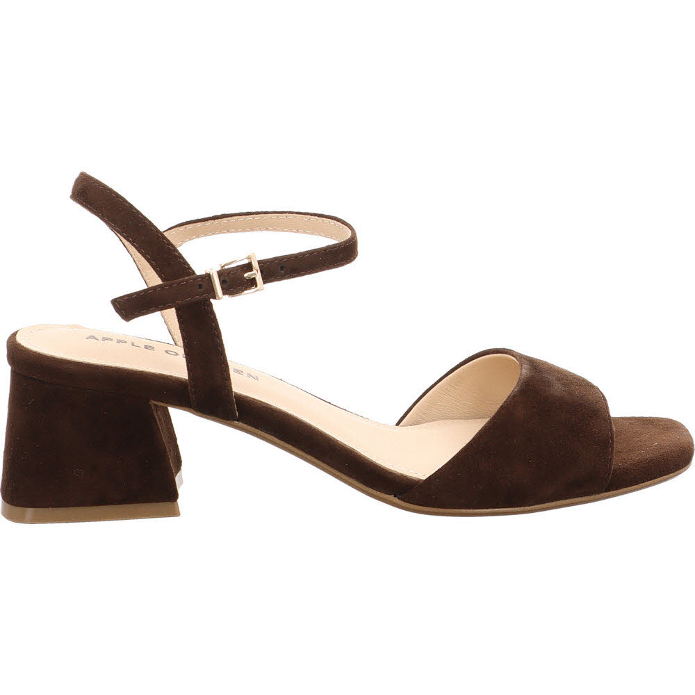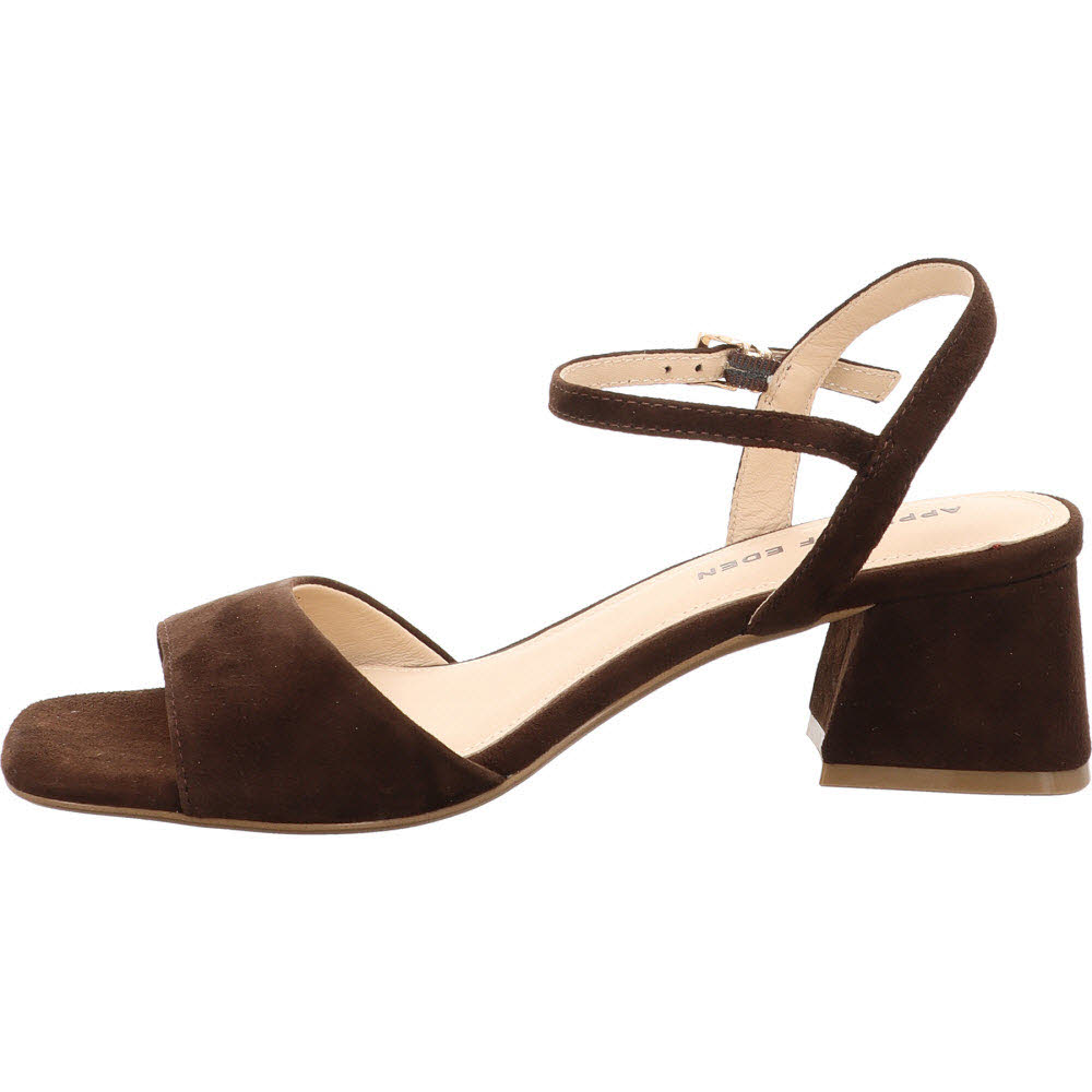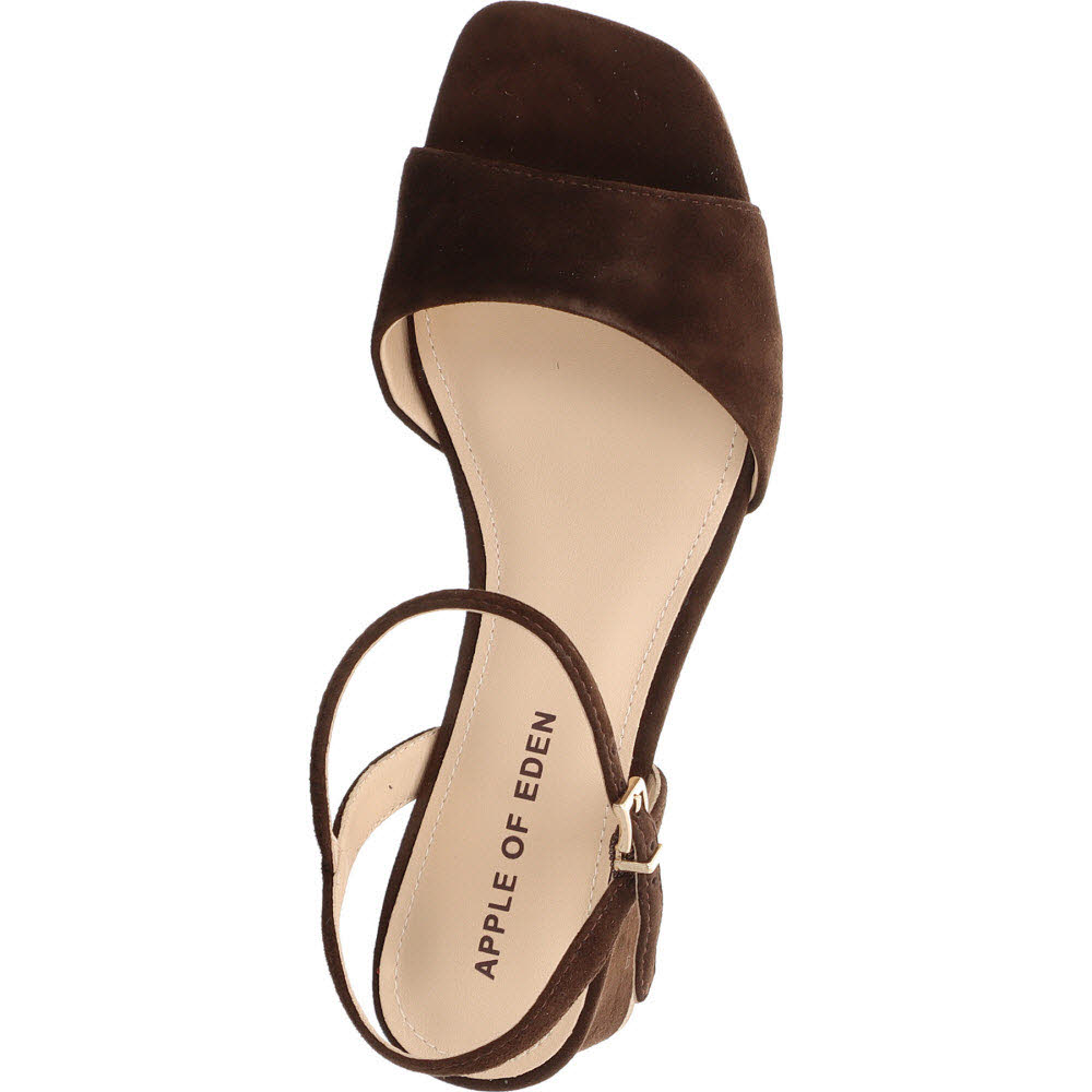 Dunkelbraun mit filigranen Riemen: die Apple of Eden FLORE Sandale für den Herbst-Übergang, wenn die Temperaturen noch Sandalen erlauben. Ziegenveloursleder, Schnalle, Lederfutter, Lederdecksohle, flache Sohle. Der dunkle Ton gibt der feinen Form Gewicht. Passt zu Denim, Creme-Hose, Midi-Kleid.